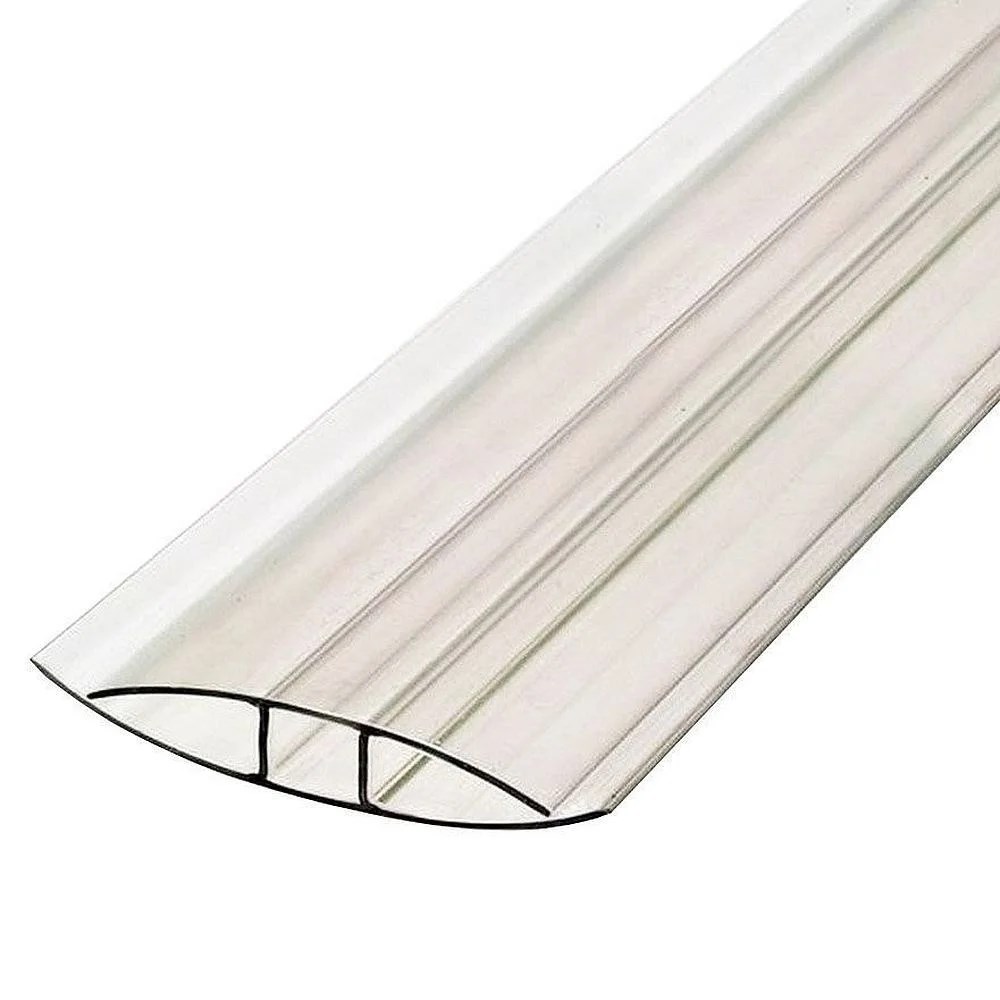 Соединительный неразъёмный профиль для сотового поликарбоната используется для стыковки между собой поликарбонатных листов толщиной 10 мм. Представляет собой длинную гибкую планку Н-образного сечения, полки которой с обеих сторон загнуты внутрь. Применяется для соединения панелей в ровных конструкциях, а также на односкатной, двускатной или арочной кровле, согласно установленным радиусам изгиба. Не является монтажным профилем и не предназначен для крепления к кровельным несущим конструкциям. Обеспечивает правильную стыковку листов, отводит дождевую воду за пределы кровли.